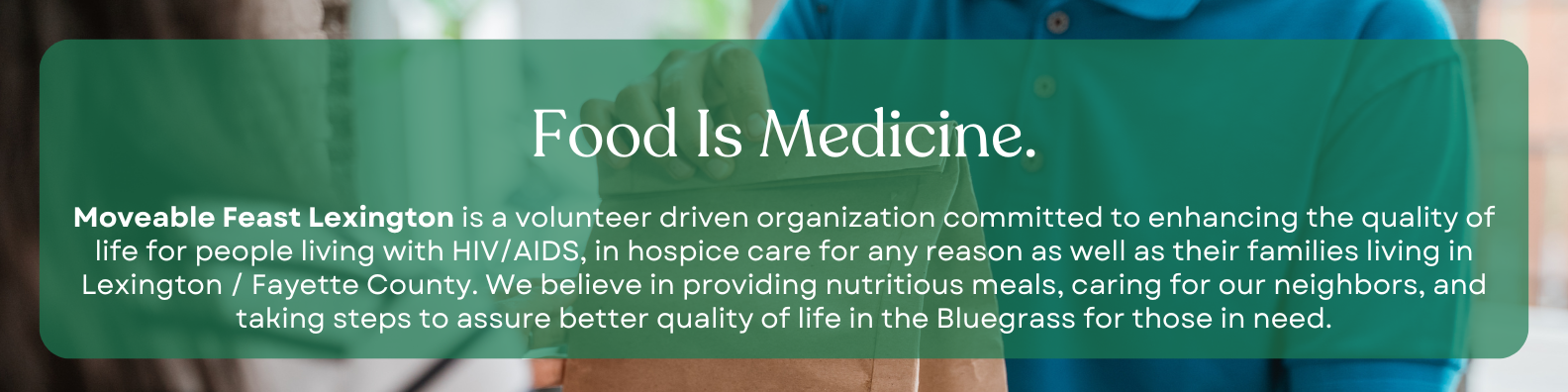 Volunteers and staff work together to provide clients with fresh meals and groceries. Volunteers also provide direction in every aspect of Moveable Feast Lexington.